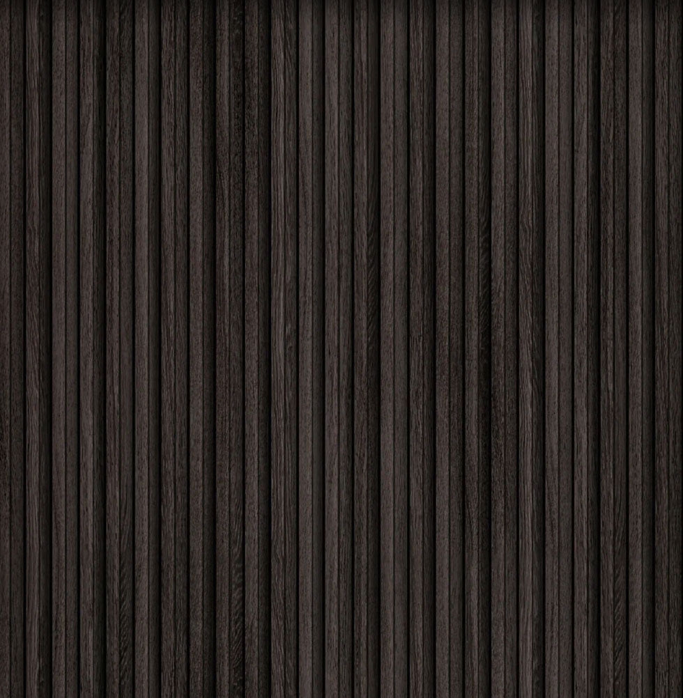 The unique combination of natural brown wood tones and matte black grooves creates a contemporary slatted effect that balances warmth with modern minimalism — ideal for accent walls and focal areas.