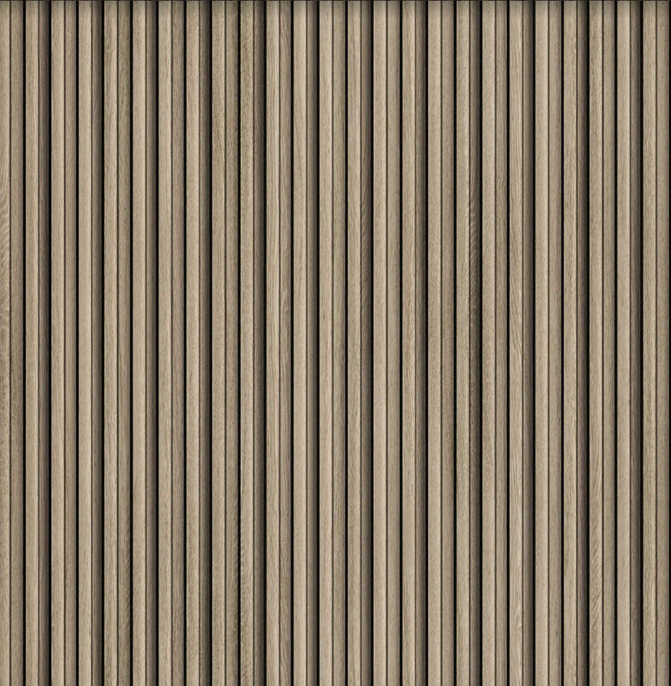 A fluted wood wall panel in a soft grey oak tone, offering a clean, contemporary look with the warmth of natural wood grain.