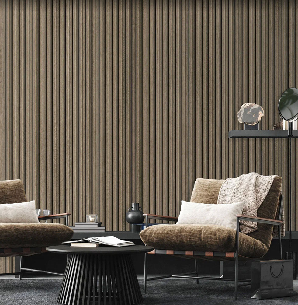 The unique combination of natural brown wood tones and matte black grooves creates a contemporary slatted effect that balances warmth with modern minimalism — ideal for accent walls and focal areas.