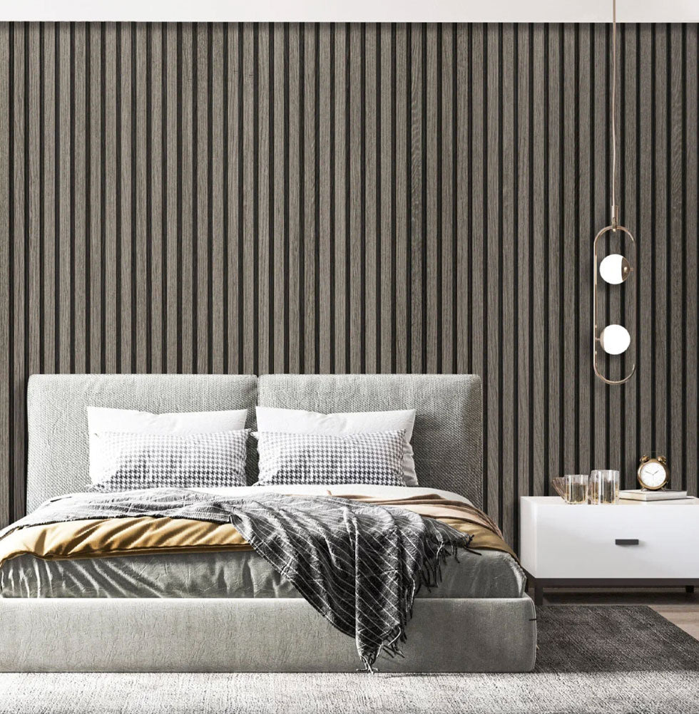 The unique combination of natural brown wood tones and matte black grooves creates a contemporary slatted effect that balances warmth with modern minimalism — ideal for accent walls and focal areas.