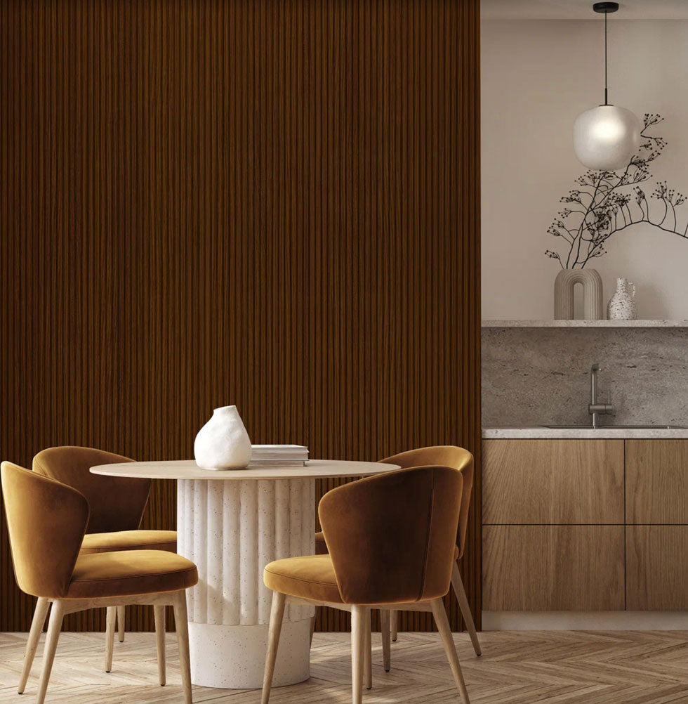 A classic fluted wood wall panel in a natural walnut tone, blending timeless character with modern texture.