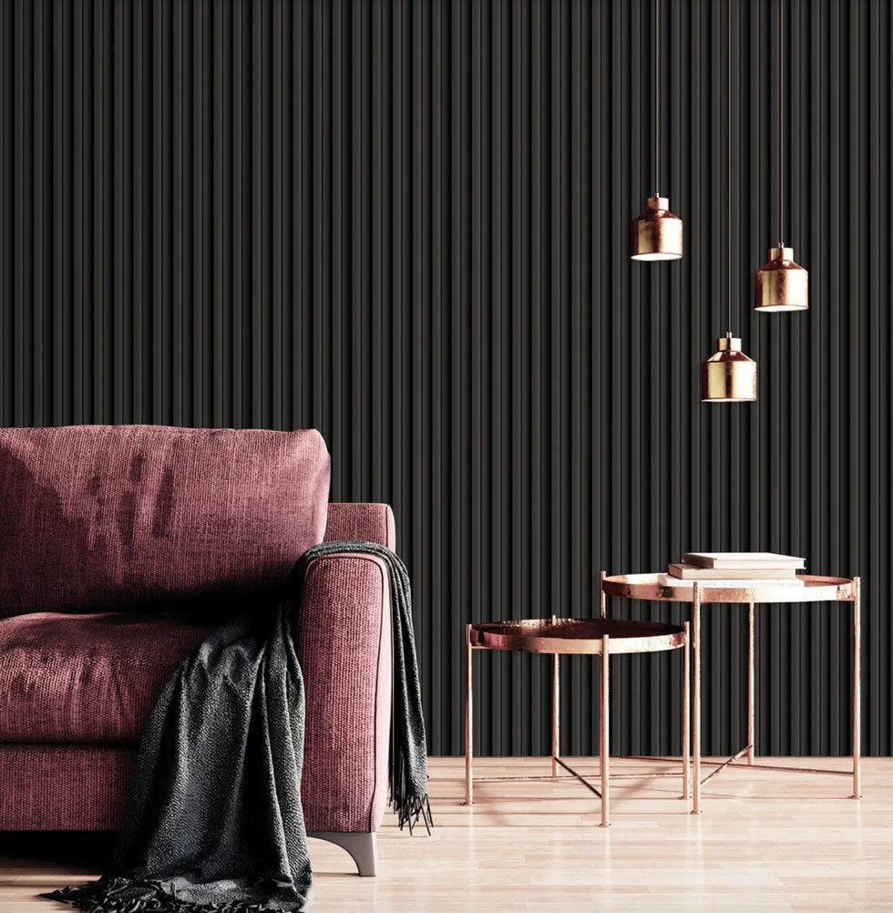The unique combination of natural brown wood tones and matte black grooves creates a contemporary slatted effect that balances warmth with modern minimalism — ideal for accent walls and focal areas.