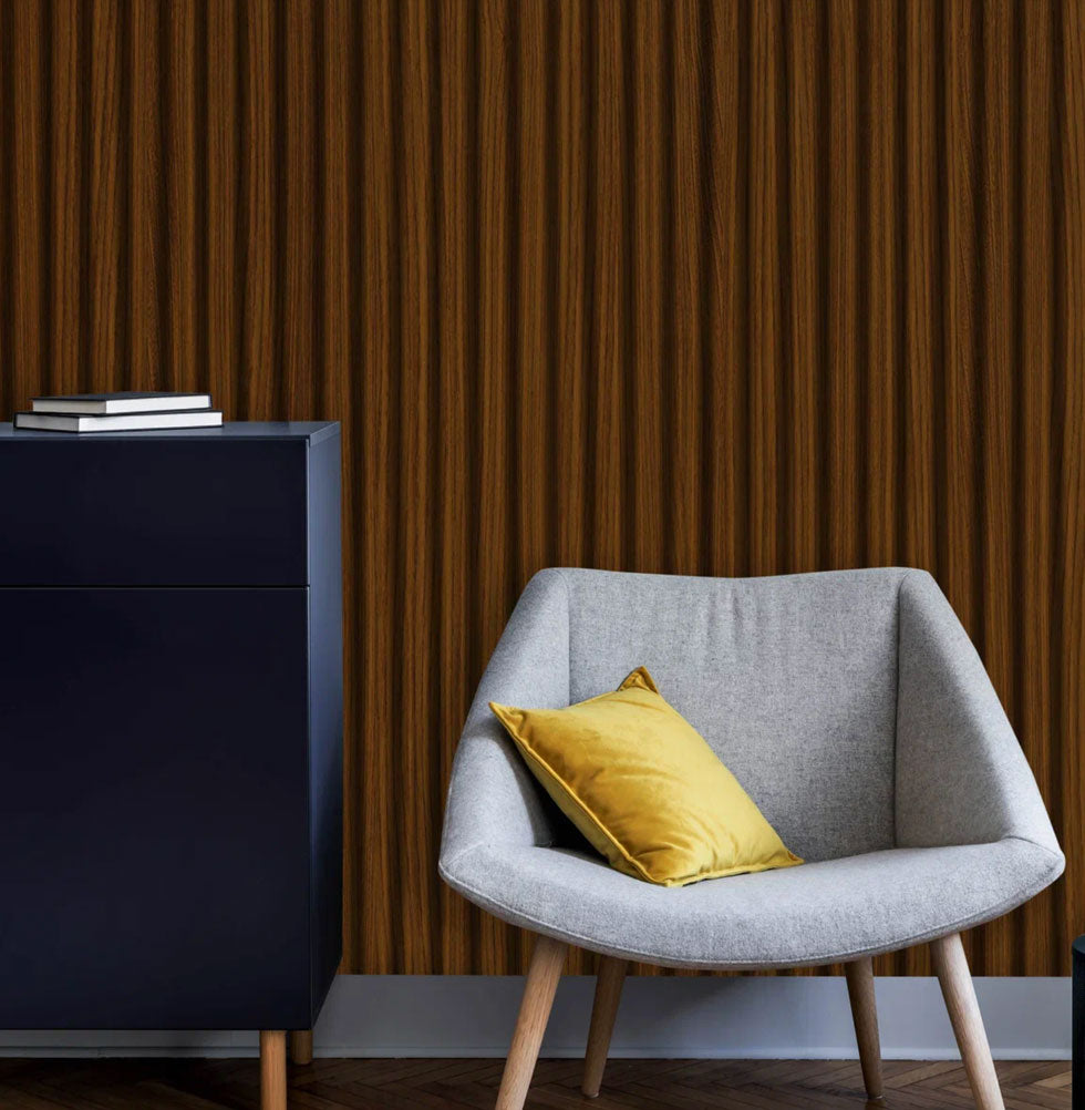 The unique combination of natural brown wood tones and matte black grooves creates a contemporary slatted effect that balances warmth with modern minimalism — ideal for accent walls and focal areas.