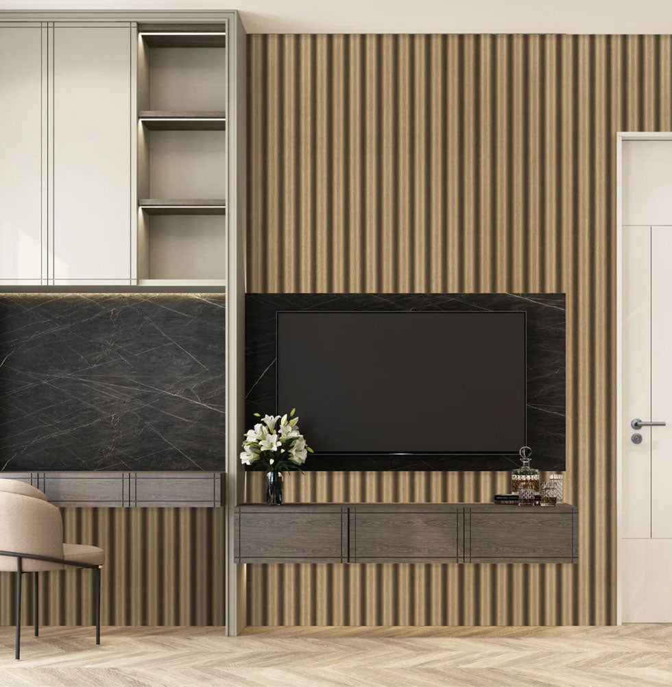 The unique combination of natural brown wood tones and matte black grooves creates a contemporary slatted effect that balances warmth with modern minimalism — ideal for accent walls and focal areas.
