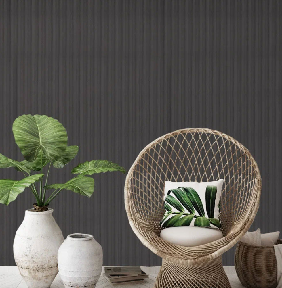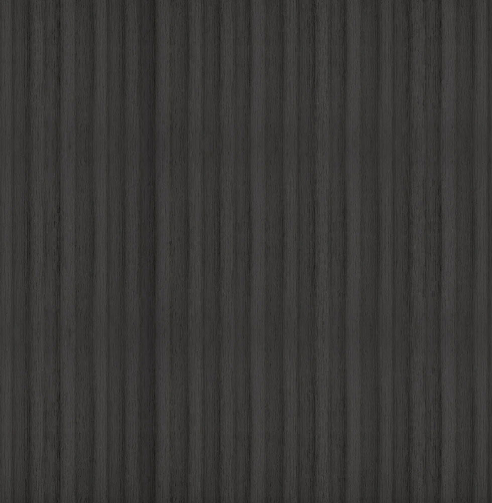 The unique combination of natural brown wood tones and matte black grooves creates a contemporary slatted effect that balances warmth with modern minimalism — ideal for accent walls and focal areas.
