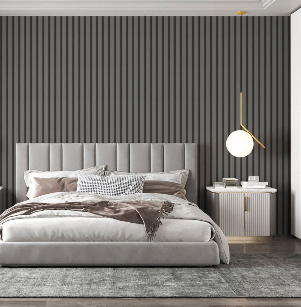 A wavy fluted wood wall panel in a sleek steel grey finish, offering a refined balance of modern design and natural texture.