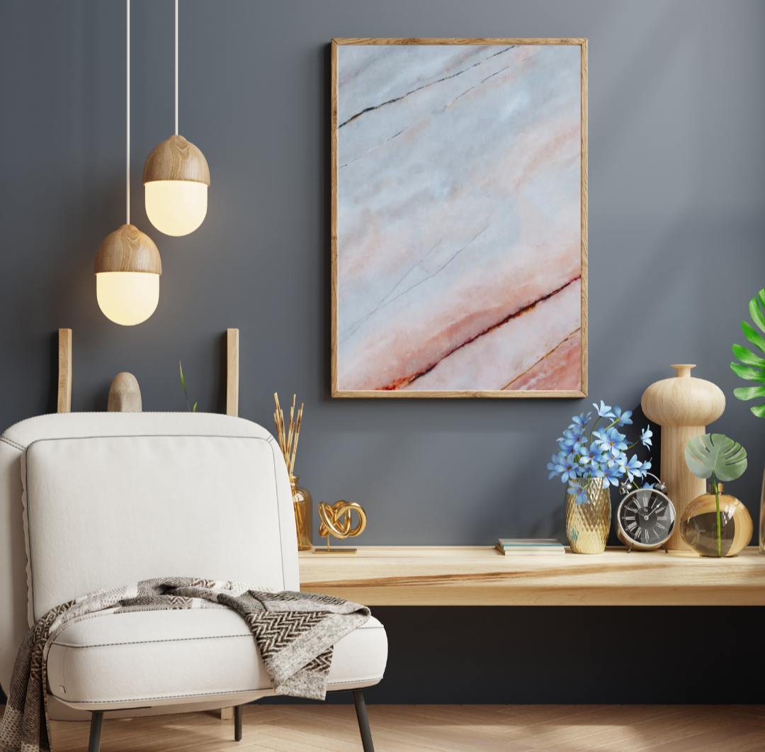 Pictured here is Sunset Skies (FX-014), a light and airy design that channels the calm energy of the sunset on a clear day. Light blues blend against earthy golden-red veins, creating a sense of movement and depth.