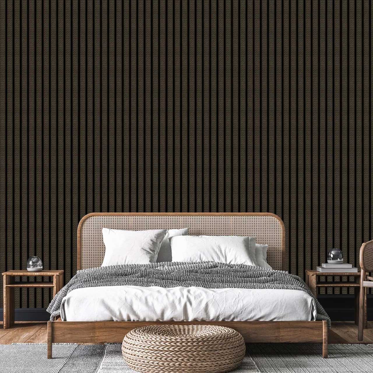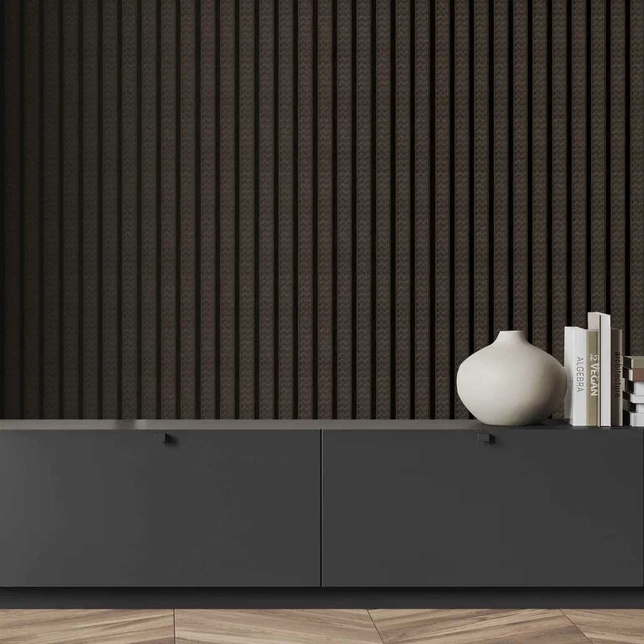 The unique combination of natural brown wood tones and matte black grooves creates a contemporary slatted effect that balances warmth with modern minimalism — ideal for accent walls and focal areas.