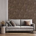The unique combination of natural brown wood tones and matte black grooves creates a contemporary slatted effect that balances warmth with modern minimalism — ideal for accent walls and focal areas.